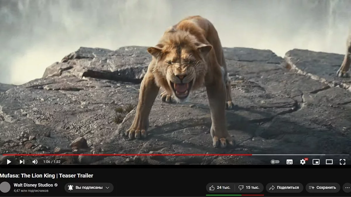 Disney показала первый трейлер CGI-фильма о льве Муфасе, отце Симбы из «Короля Льва». В паре кадров можно увидеть Тимона и Пумбу.
