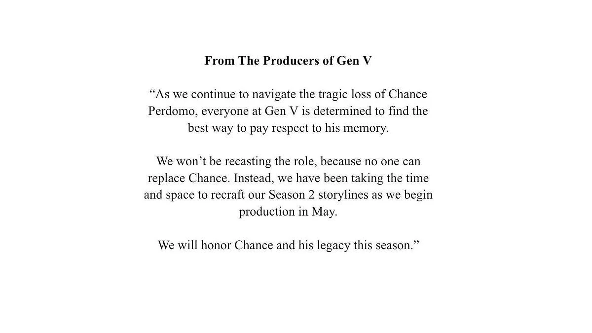 Как сообщили продюсеры в соцсетях, они не будут искать замену актеру Ченсу Пердомо (Chance Perdomo):