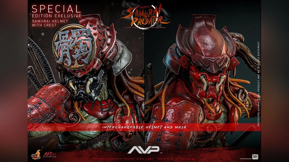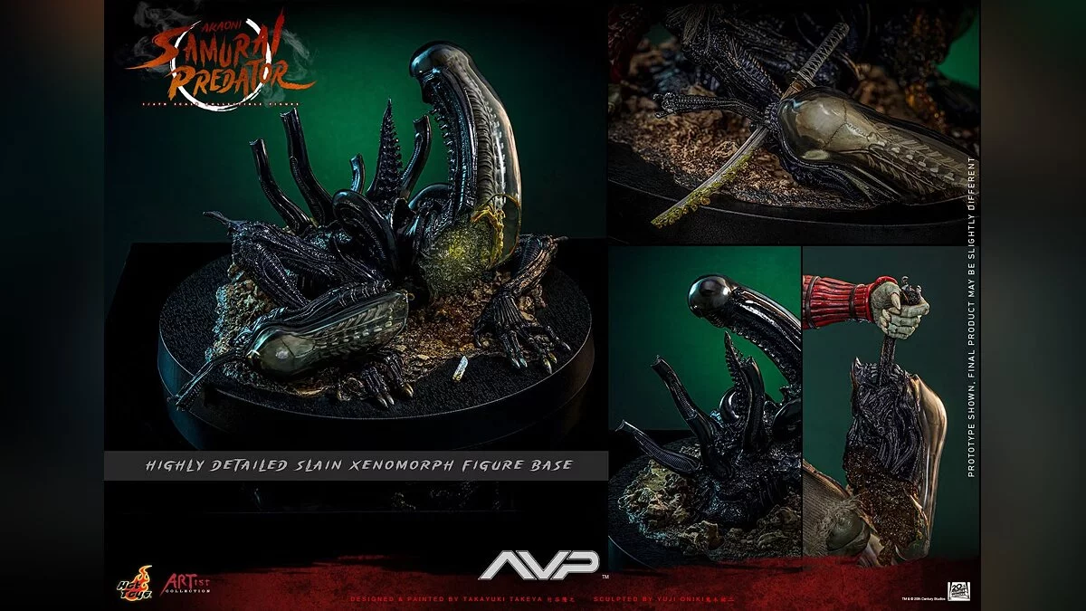 Фигурка выполнена в масштабе 1:6. Хищника облачили в красные самурайские доспехи с большим количеством деталей. На изображениях ниже можно рассмотреть стальные когти, крепящиеся на руку, наплечную пушку и набор катан, одна из которых оплавлена кровью Чужого. В комплекте идет трофей в виде головы ксеноморфа, чье тело и стало основанием для фигурки. Моделька также получит несколько съемных рук и два набора челюстей.