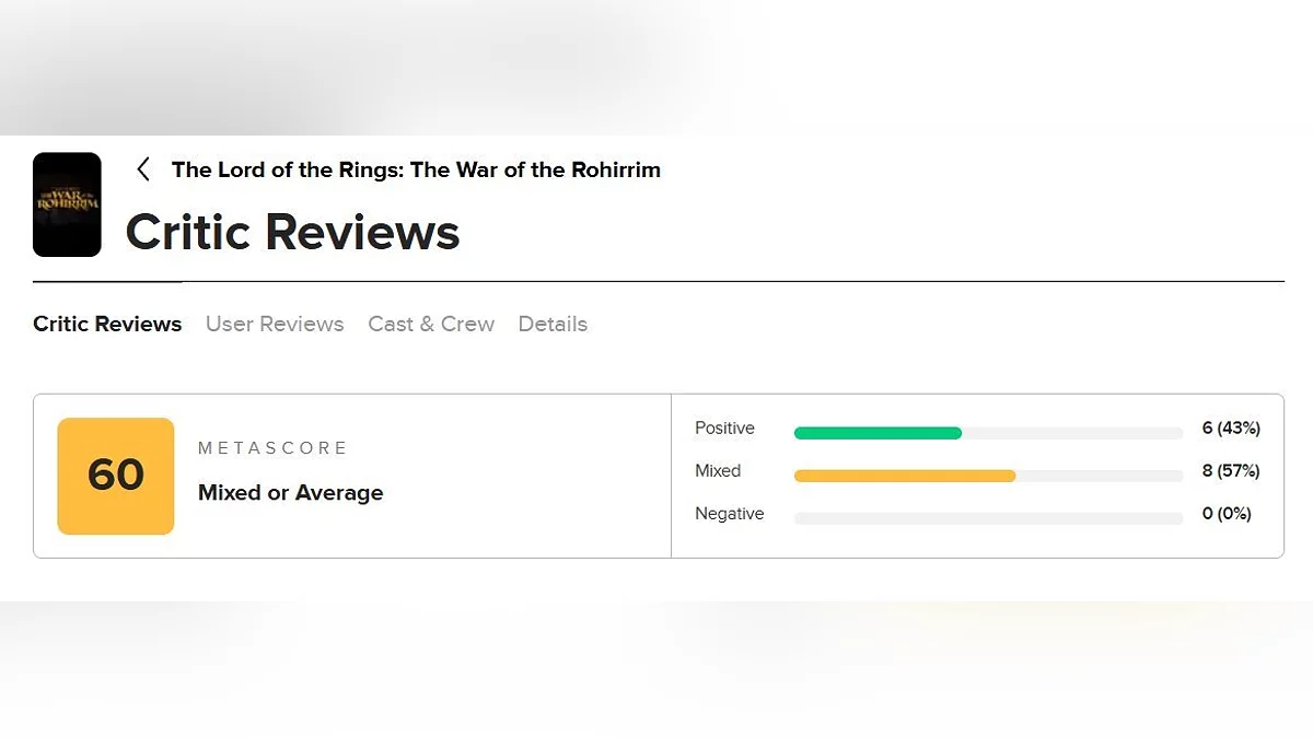 Пресса уже оценила полнометражное аниме «Властелин колец: Война рохиррим», официальная премьера которого состоится 13 декабря этого года. На Metacritic средняя оценка этого проекта составляет 60 баллов.