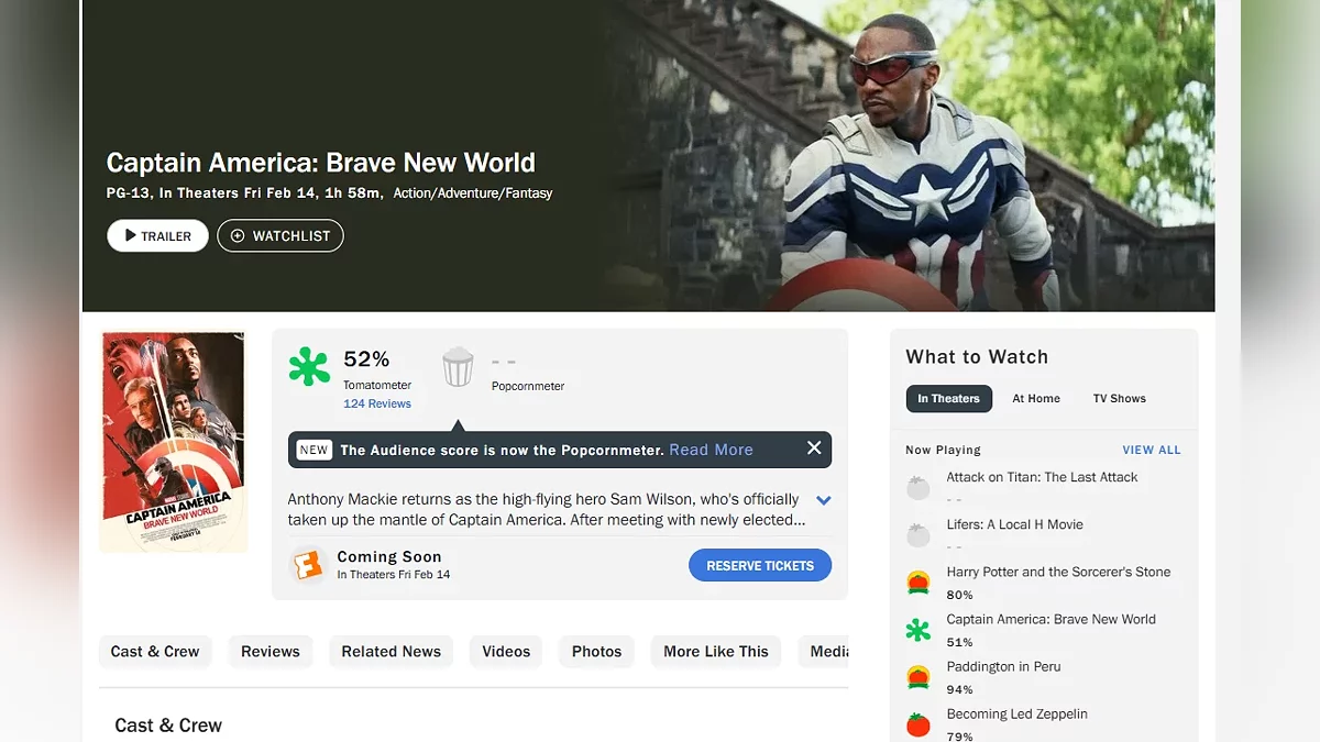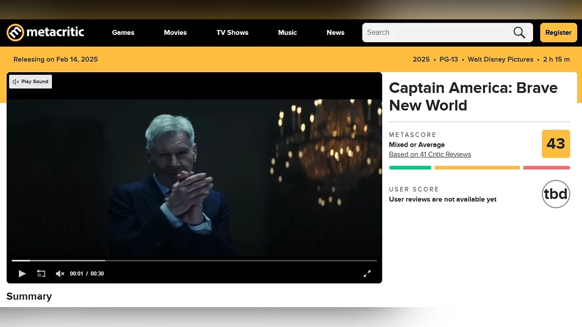 У Marvel появился потенциальный кандидат в провалы года: «Капитан Америка: Дивный новый мир» (Captain America: Brave New World) с Харрисоном Фордом (Harrison Ford), Джанкарло Эспозито (Giancarlo Esposito) и Энтони Маки (Anthony Mackie) получил низкие оценки критиков. На данный момент у картины 52% рейтинга «свежести» на Rotten Tomatoes и 43/100 баллов на Metacritic.
