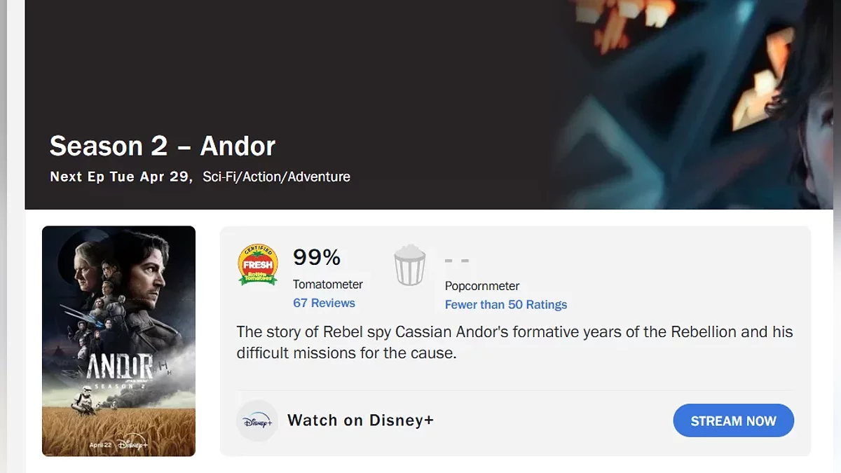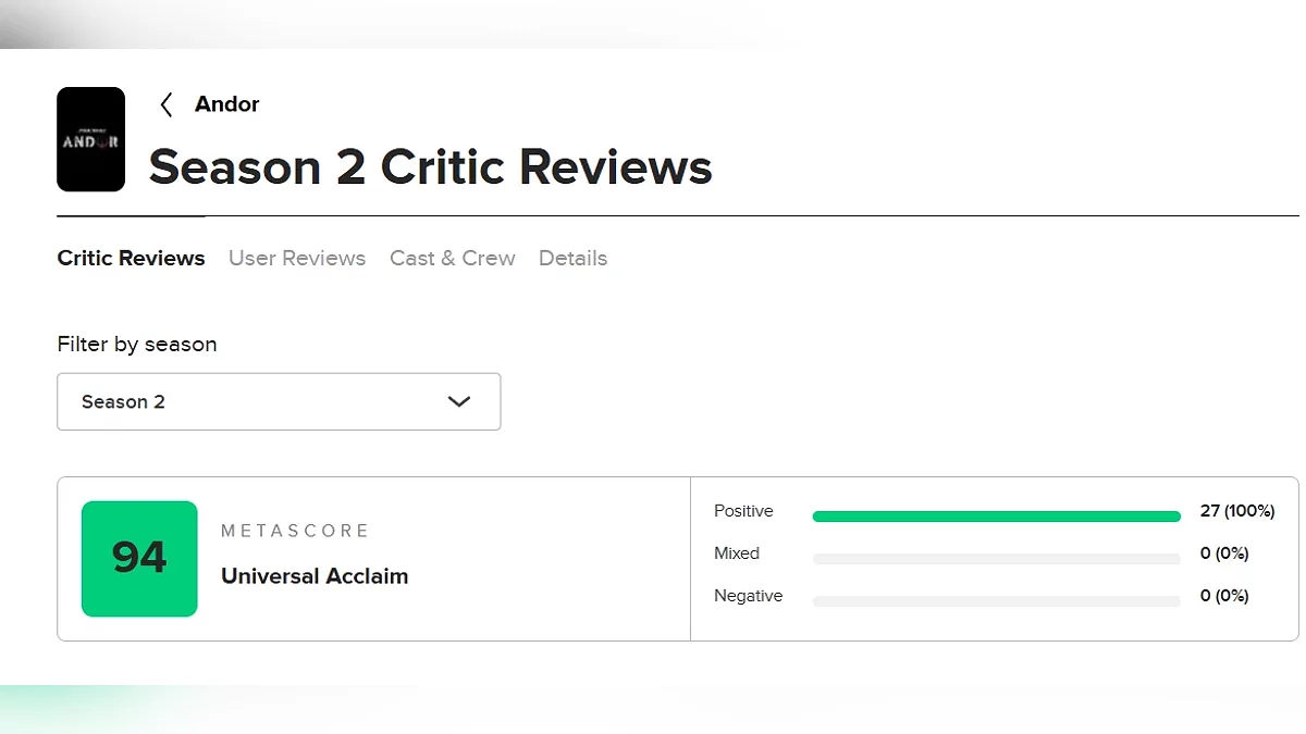 Второй сезон сериала «Андор» (приквел к фильму «Изгой-один. Звёздные войны: Истории») получил крайне высокие оценки от критиков. К слову сейчас это один из самых высокооцененных проектов по «Звездным войнам». На Metacritic он получил 94 балла, а на Rotten Tomatoes — 99%.