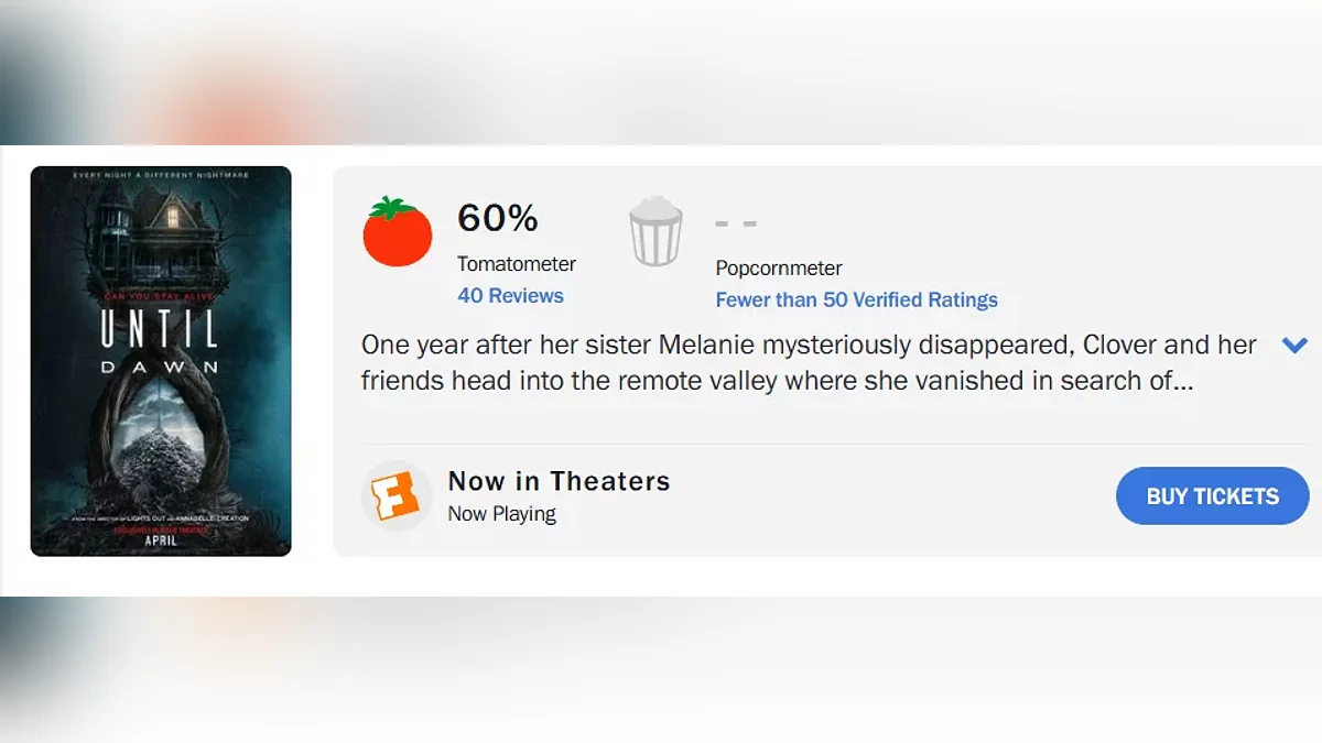 Появились оценки фильма «Дожить до рассвета», который основан на одноименной игре Supermassive Games, но имеет некоторые отличия в сюжете и персонажах. На Metacritic кинолента получила 56 баллов, а на Rotten Tomatoes ее рейтинг 60%.