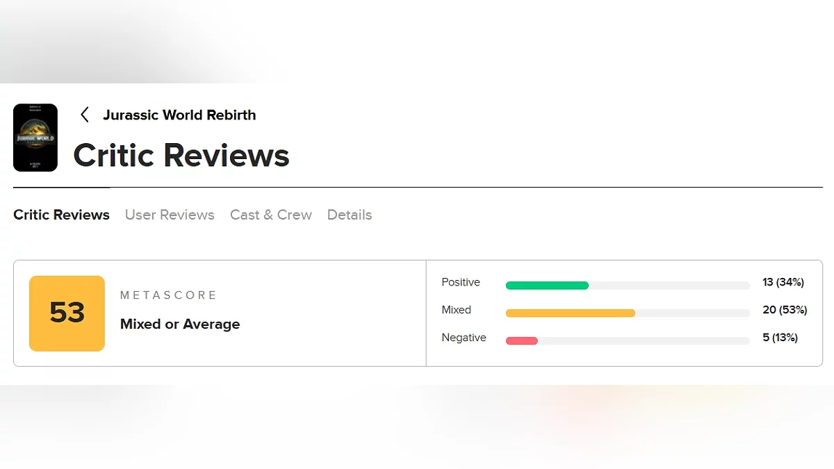 Фильм «Мир юрского периода: Возрождение» получил первые оценки от прессы. На момент написания новости на Metacritic кинолента имеет 53 балла, а на Rotten Tomatoes рейтинг составляет 57%.
