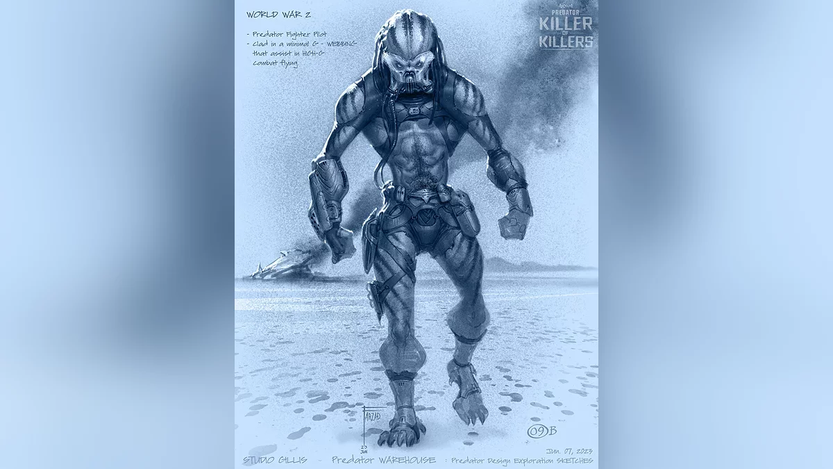 Меня пригласили в проект с самого начала, чтобы помочь визуализировать и предложить несколько вариантов того, как могут выглядеть Хищники, люди и их оружие в этих трёх разных временных промежутках. Обычно я делаю как можно больше быстрых концептуальных набросков, чтобы обозначить визуальные ориентиры и помочь себе и команде увидеть персонажа целиком и проникнуться его образом мышления, даже если конечный дизайн будет отличаться.