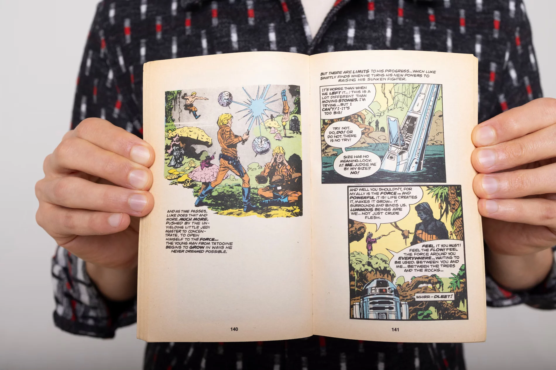 Эта деталь оставалась в тексте, хотя почти всё остальное из сценария попало в фильм без изменений. Более того, в новеллизации 1980 года Йода также описывался как «синекожий», а в комиксах Marvel того же периода он изображён фиолетовым, меньше ростом и с длинными белыми волосами. Это указывает, что смена цвета произошла буквально перед выходом фильма.