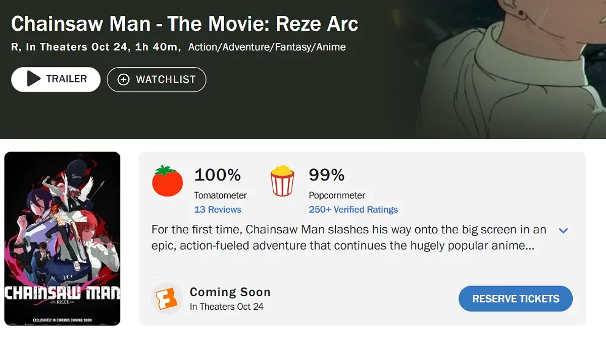 Новое аниме «Человек-бензопила. Фильм: История Резе» (Chainsaw Man — The Movie: Reze Arc) получило очень положительные отзывы критиков. К примеру, сейчас его рейтинг на Rotten Tomatoes составляет 100%.