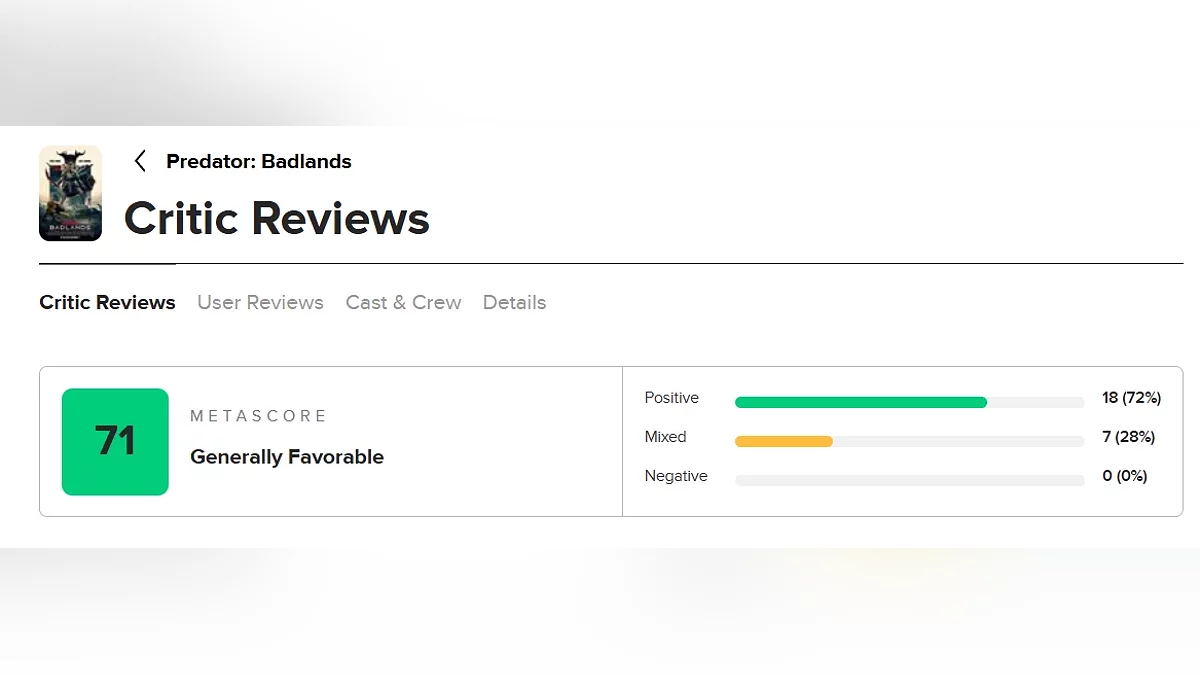 На Metacritic появились первые оценки фильма «Хищник: Планета смерти» — на момент написания новости рейтинг составляет 71 балл (и 89% на Rotten Tomatoes). Большинство критиков положительно оценили кинокартину.