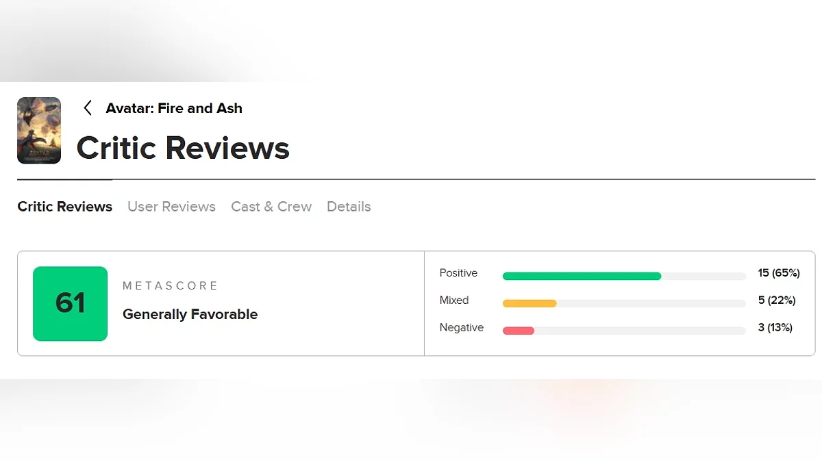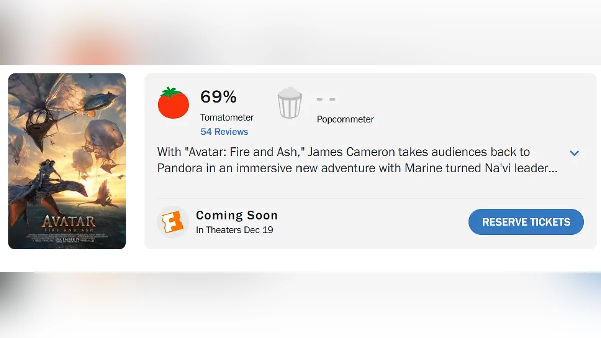 В сети уже появились первые оценки фильма «Аватар: Пламя и пепел» (Avatar: Fire and Ash) Джеймса Кэмерона (James Cameron). На момент написания новости на Metacritic кинолента имеет 61 балл, а рейтинг на Rotten Tomatoes составляет 69%.