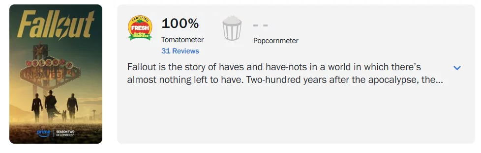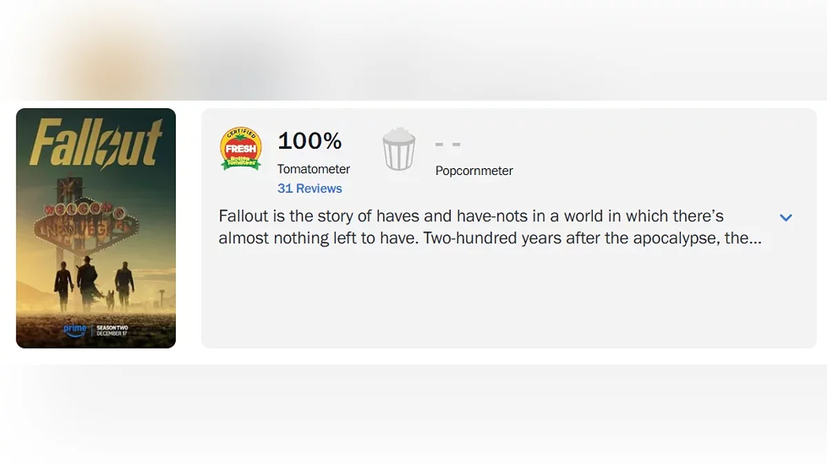До премьеры второго сезона сериала «Фоллаут» остались считанные часы, но на Rotten Tomatoes уже появились первые отзывы критиков и сформирован предварительный рейтинг. На момент написания новости он составляет 100%, но, скорее всего, рейтинг немного изменится в ближайшие дни.