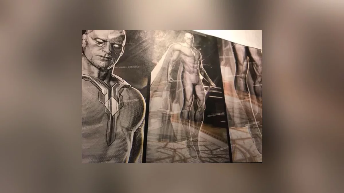 На картинке изображен совершенно бледный Вижн. Видно, что его голова потерпела определенные повреждения. Все это перекликается с аркой из комиксов, в которой Вижн выглядел так же и был абсолютно лишен эмоций.