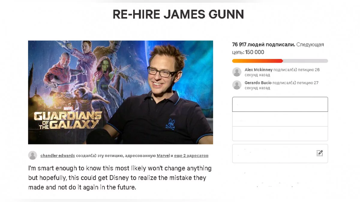 Понимаю, что эта петиция вряд ли что-то изменит, но я хочу, чтобы Disney увидела, какую ошибку она совершила и в будущем постаралась избежать подобной ситуации. Если человек говорит всякую фигню во время работы с серьезной франшизой, его можно уволить, но ситуация с Джеймсом абсолютно другая. Это были шутки и только шутки (пусть плохие и совсем не смешные), опубликованные много лет назад.