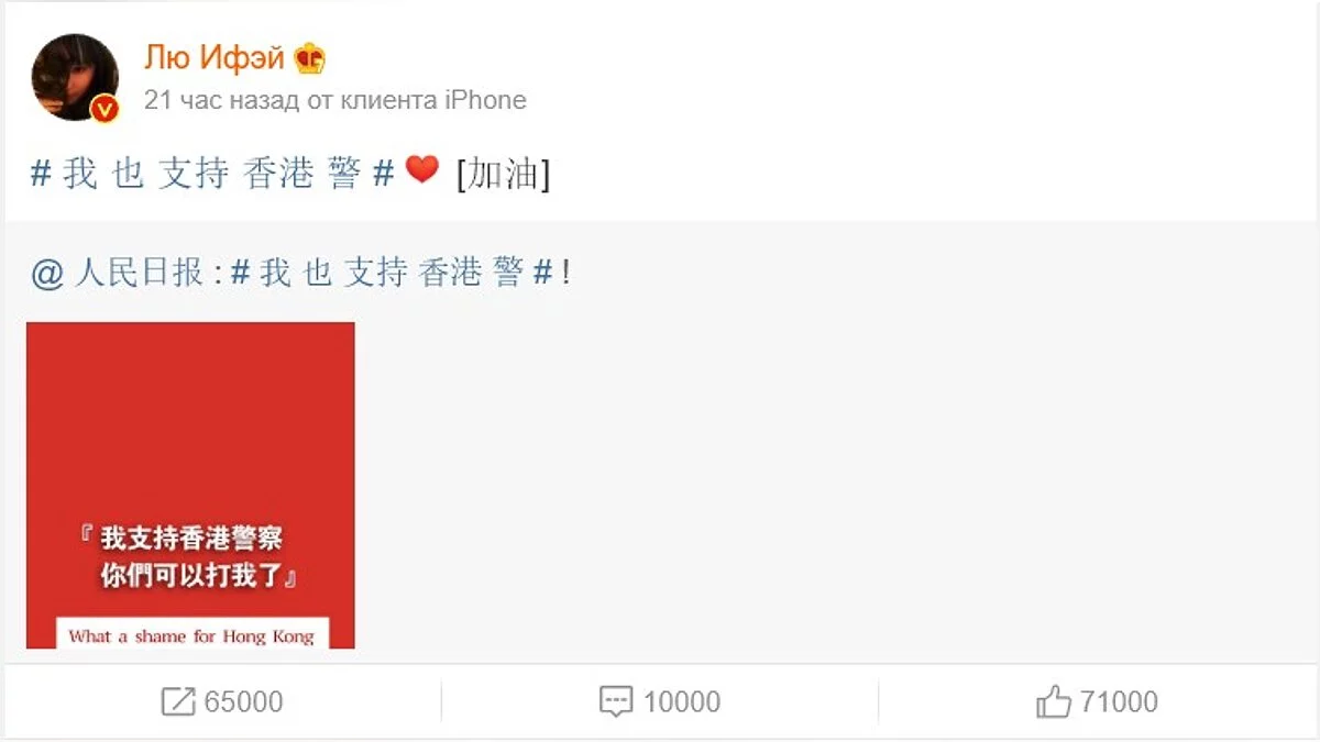 Перевод: «Я также поддерживаю полицию Гонконга».