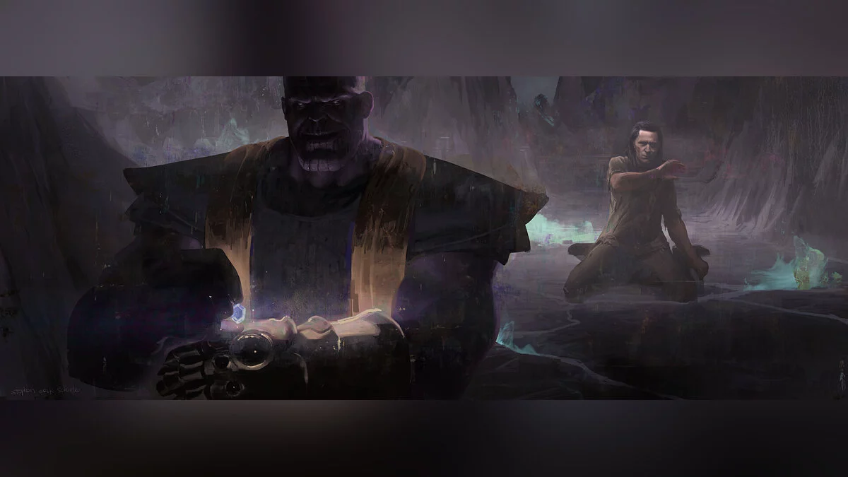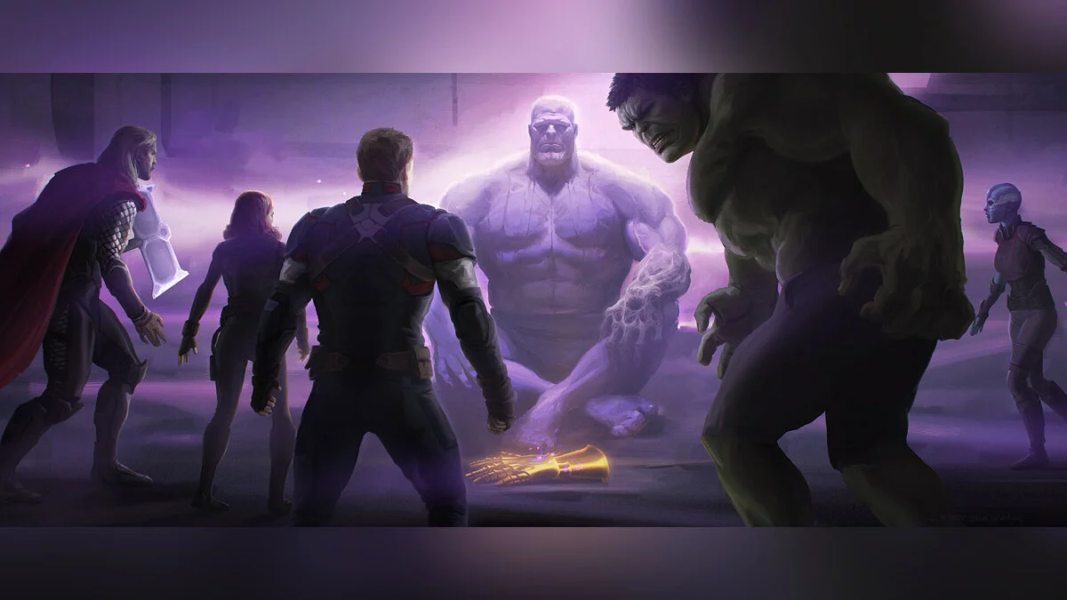 Также на артах можно увидеть, как Мстители пришли к Таносу после щелчка. На этом концепте его рука также пострадала, но при этом Перчатка бесконечности осталась целой. Топор Тора отличался от Гром-секиры.