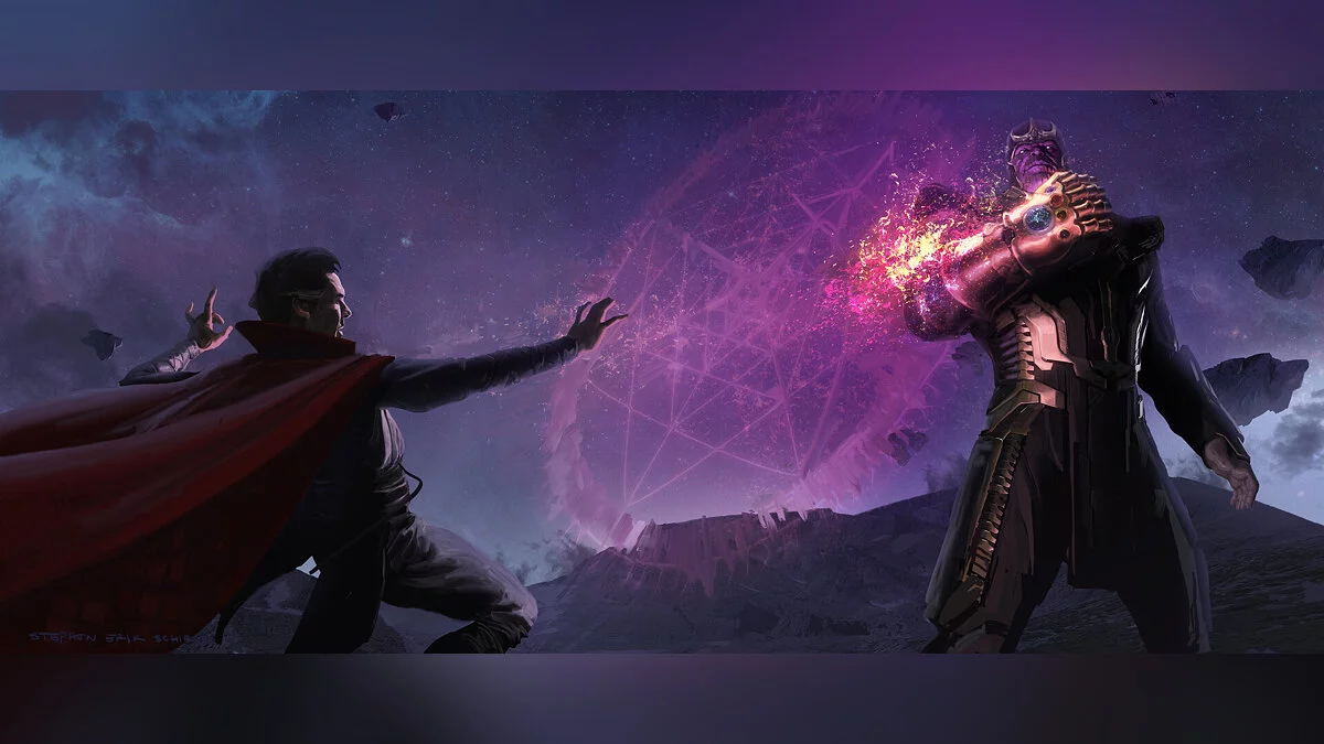 На другом изображении Умный Халк встречался с одним из своих поклонников. Доктор Стрэндж сражался с Таносом, где его дизайн был больше основан на сцене после титров из первых «Мстителей».