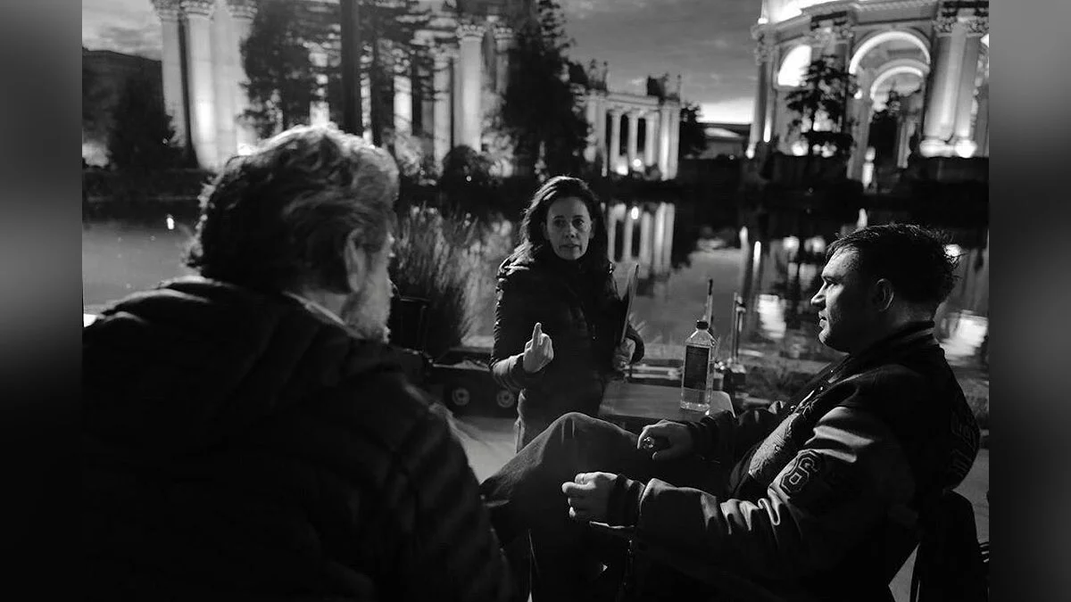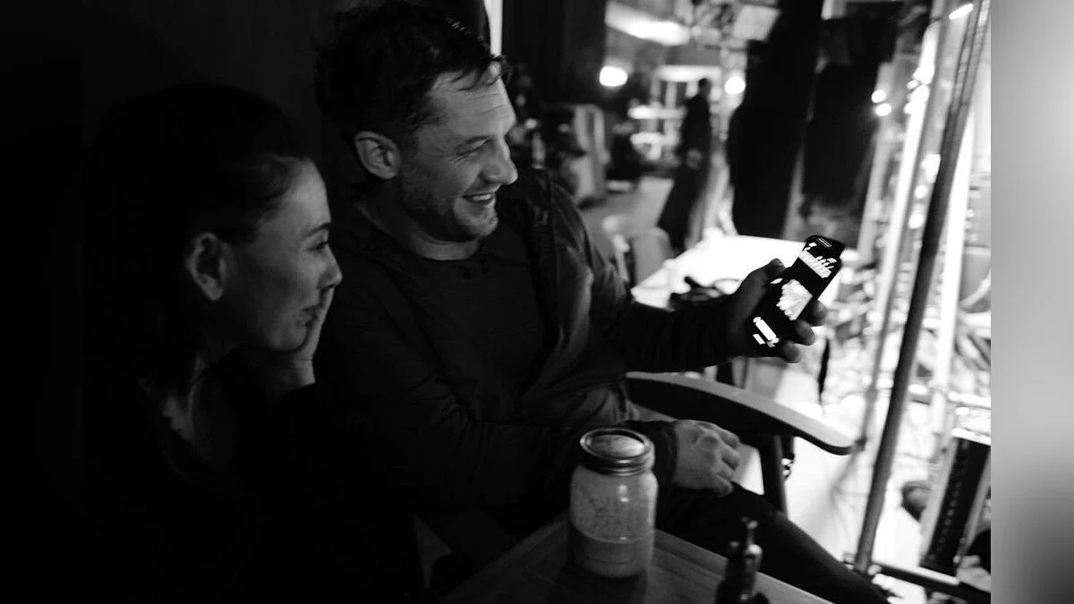 На еще двух фотографиях Том Харди и продюсер ленты Келли Марсел (Kelly Marcel), которая также является давним другом актера, обсуждают детали производства, а также смотрят что-то веселое на телефоне.