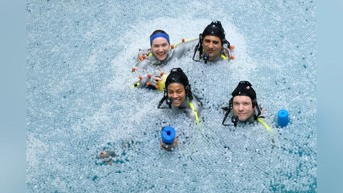 Актеры находятся в бассейне с 900 тыс. галлонами воды. Вокруг них размещены белые шарики, которые нужны, чтобы свет от приборов не мешал во время подводной съемки.