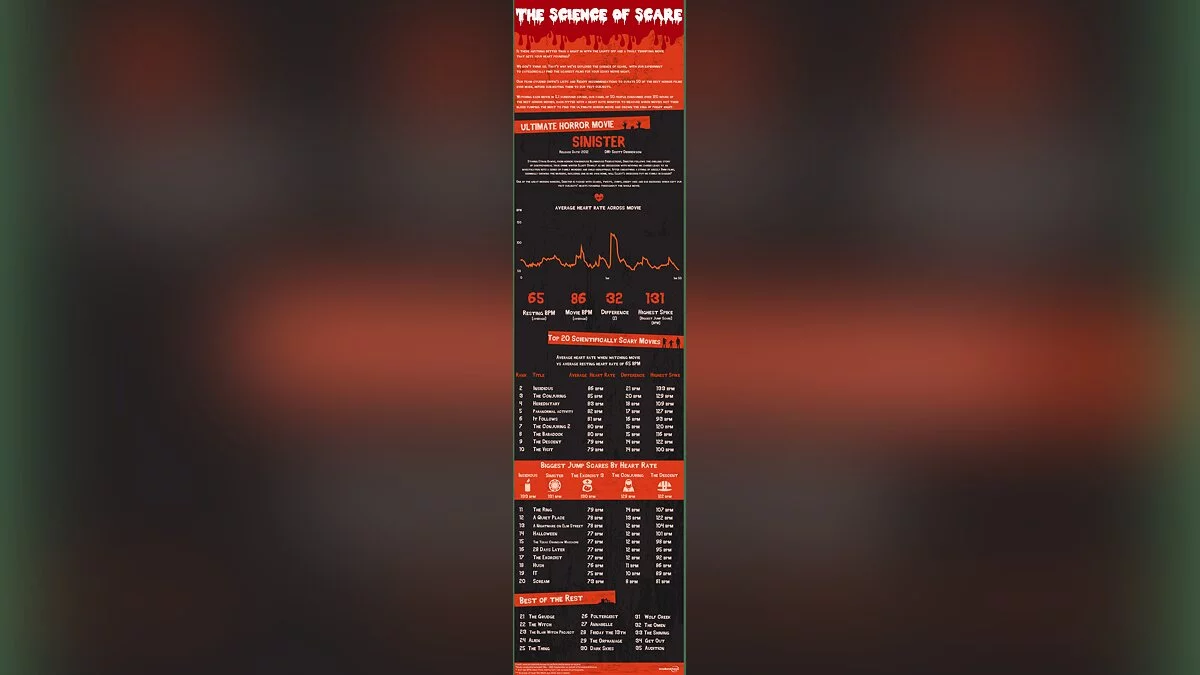 Британская компания Broadbandchoices в рамках исследования Science of Scare собрала список из 50 лучших хорроров, исходя из их популярности на IMDb и Reddit. В итоге получились 120 часов отборной крипоты, которой пугали несчастных добровольцев, согласившихся принять участие в исследовании.