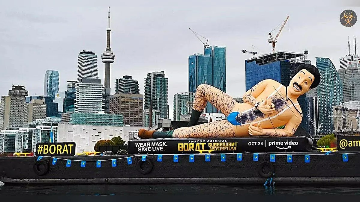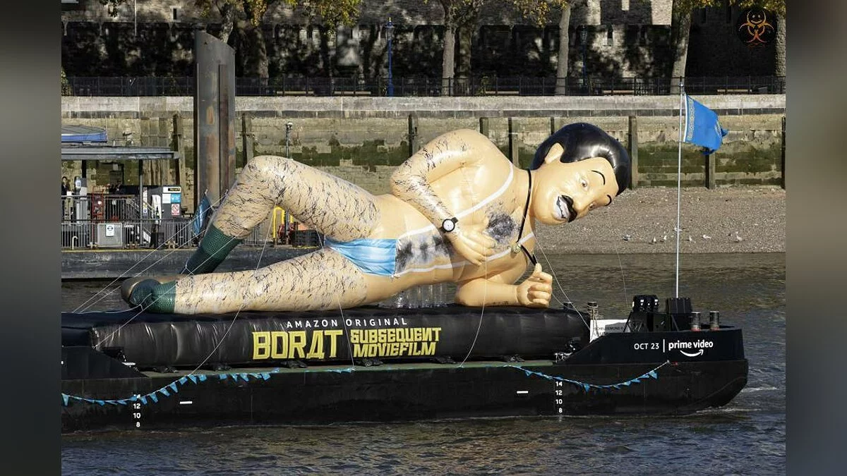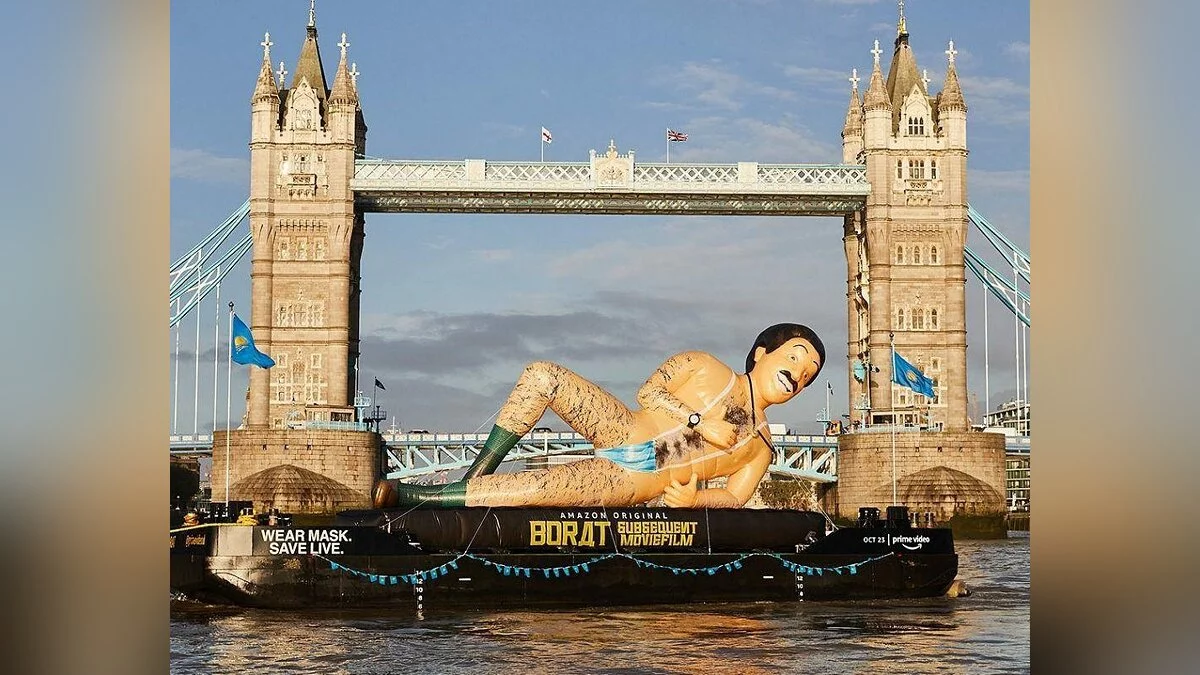 Сегодня, 23 октября, на Amazon Prime Video выходит сиквел «Бората». И потому компания прибегла к весьма необычной промоакции. На реках Лондона, Торонто и Нью-Йорка были запущены гигантские надувные куклы Бората в мэнкини из медицинской маски. Очевидцы уже поделились фотографиями и видео в социальных сетях.