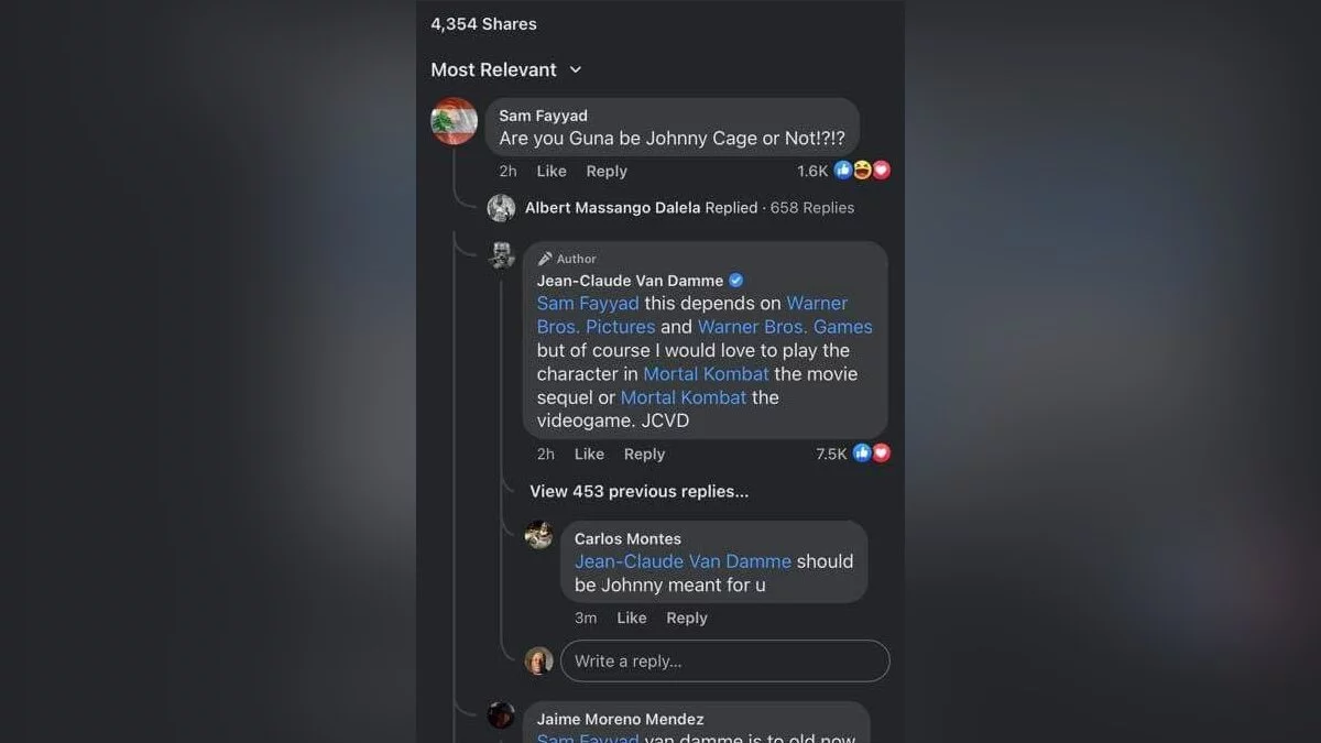 В Facebook внимательные пользователи успели заснять скриншот с комментарием знаменитого актера, который отвечая на вопрос фаната, дал понять, как он относится к идее сыграть Джонни Кейджа в Mortal Kombat.