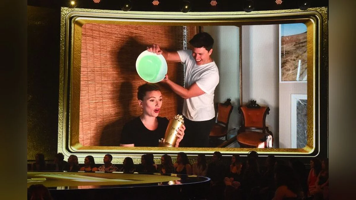 Звезда кинофраншизы Marvel Скарлетт Йоханссон (Scarlett Johansson) сегодня получила награду MTV. Актриса не смогла попасть на церемонию, поэтому свою благодарственную речь проводила по видеосвязи. В какой-то момент на Йоханссон стала литься зелёная жидкость. От неожиданности она не смогла сдержать ругань.