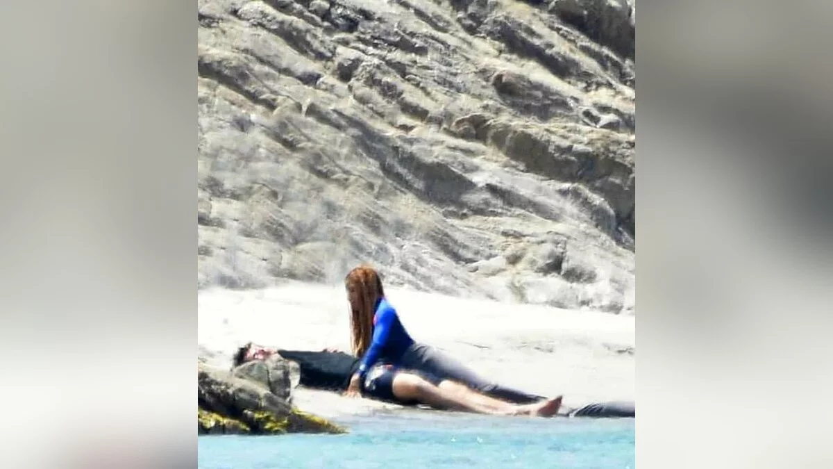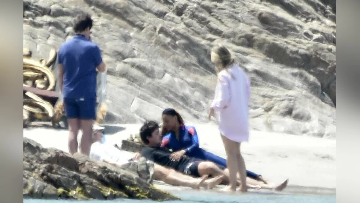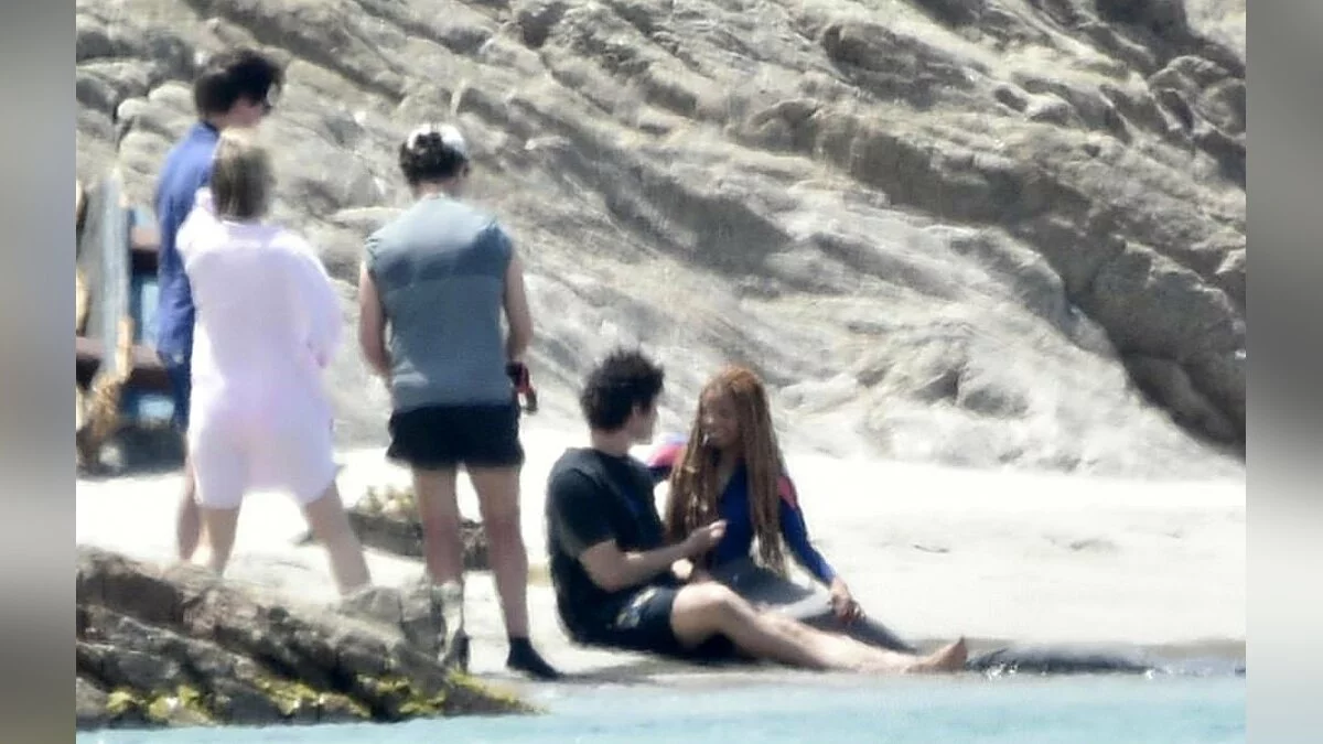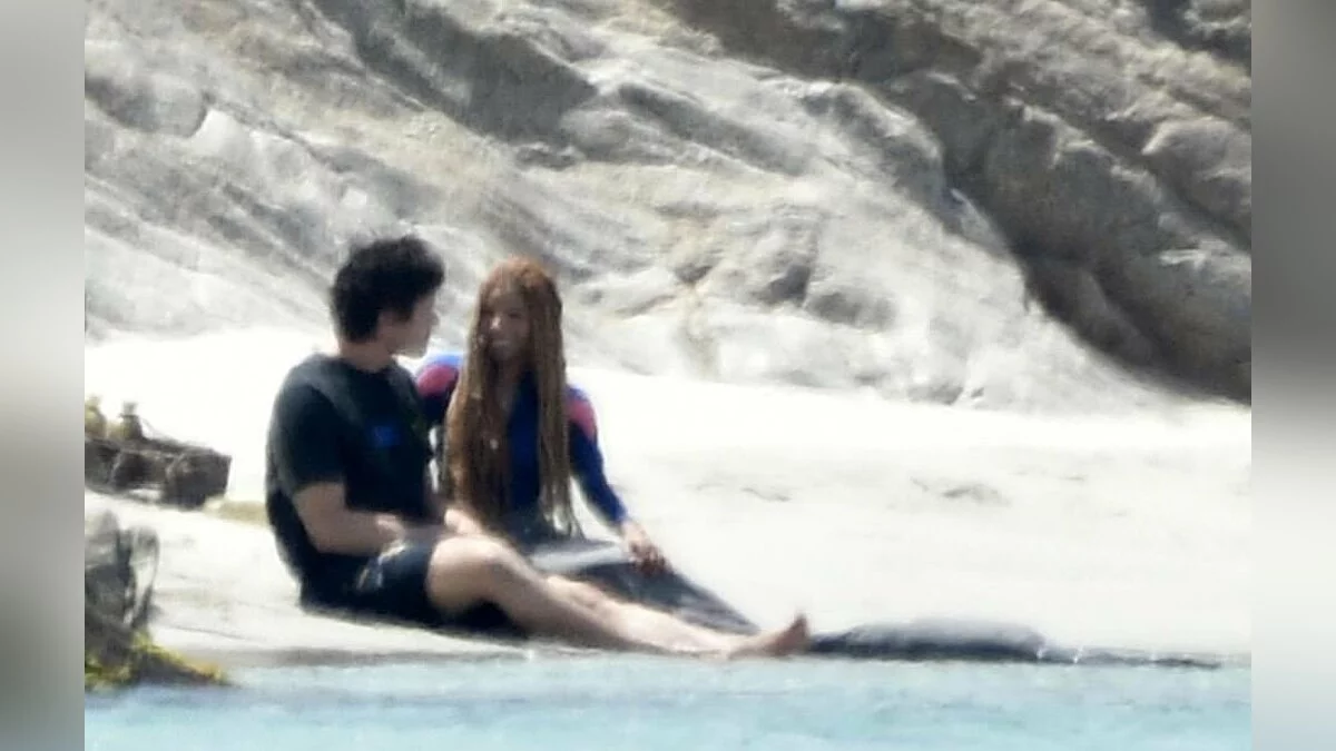 Съемки проходят в Италии. На фото Холли Бэйли в образе Русалочки сидит на пляже. Рядом с ней находится актер Джона Хауэр-Кинг (Jonah Hauer-King), который исполняет роль принца Эрика.