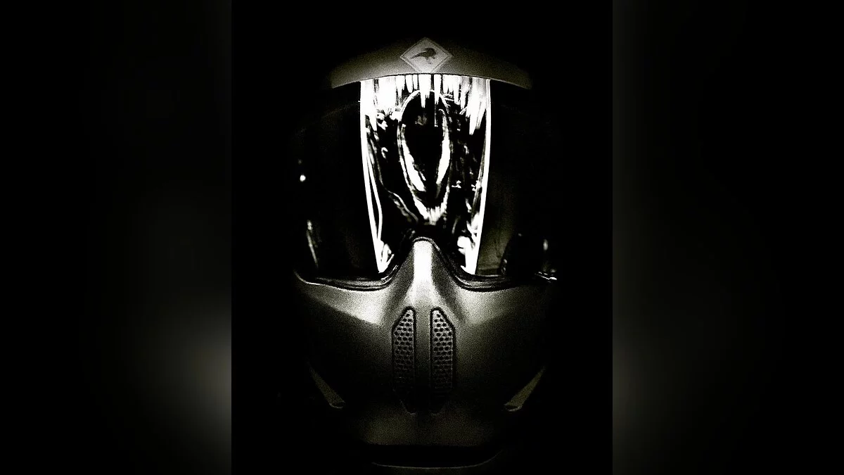 На фото показан мотошлем с отражением Венома. Стоит заметить, что персонаж Эдди Брок, роль которого исполняет Том Харди, как раз предпочитает ездить на мотоцикле. К примеру, в первом фильме герой ездил на байках Ducati.