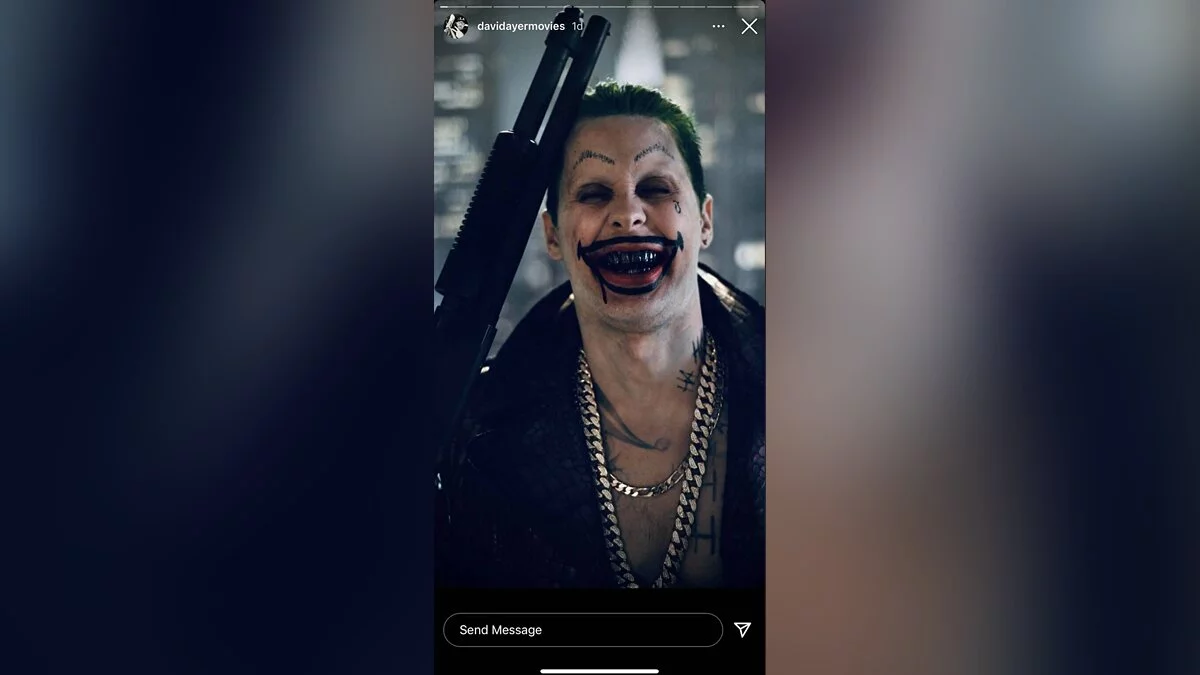 Режиссер Дэвид Эйер (David Ayer) продолжает публиковать вырезанные кадры из «Отряда самоубийц» 2016 года. На днях он добавил в свои истории Instagram (признано в России экстремистской организацией) снимок, на котором показан альтернативный образ Джокера в исполнении Джареда Лето (Jared Leto).