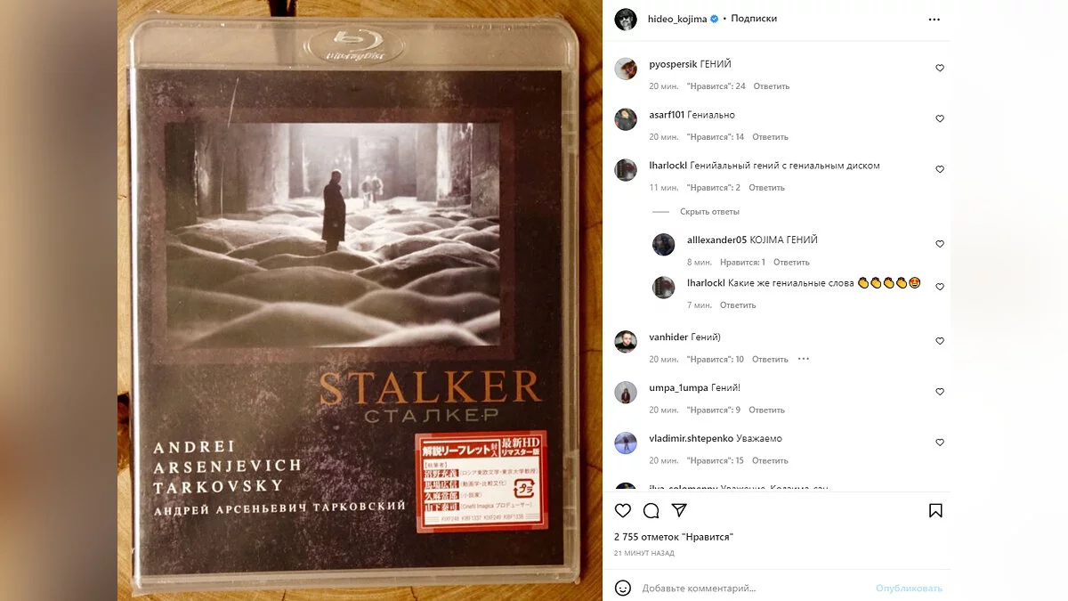 На официальной страничке Хидео Кодзимы (Hideo Kojima) в Instagram (признано в России экстремистской организацией) вновь активизировались русскоязычные фанаты японского геймдизайнера. Все из-за недавнего поста, в котором он показал диск с культовым советским фильмом «Сталкер» режиссера Андрея Тарковского.