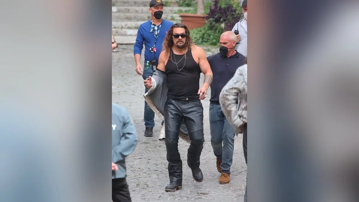 На фото Джейсон Момоа одет в кожаны штаны, черную майку и куртку. В сцене также можно увидеть черный мотоцикл персонажа. Съемки проходят в Италии.
