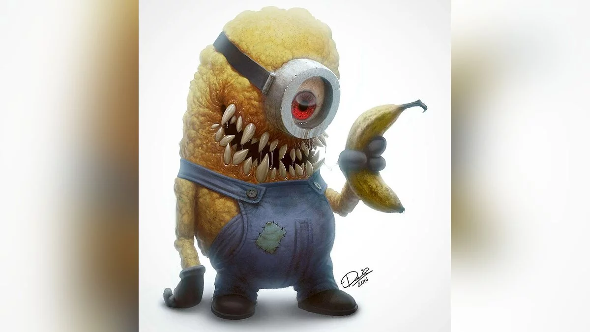 Цифровой художник Мигель Васкес (Miguel Vasquez) опубликовал свою новую работу, на которой представил жуткую версию миньона из мультиков, пытающегося съесть банан. К слову, фрукт оказался живым.