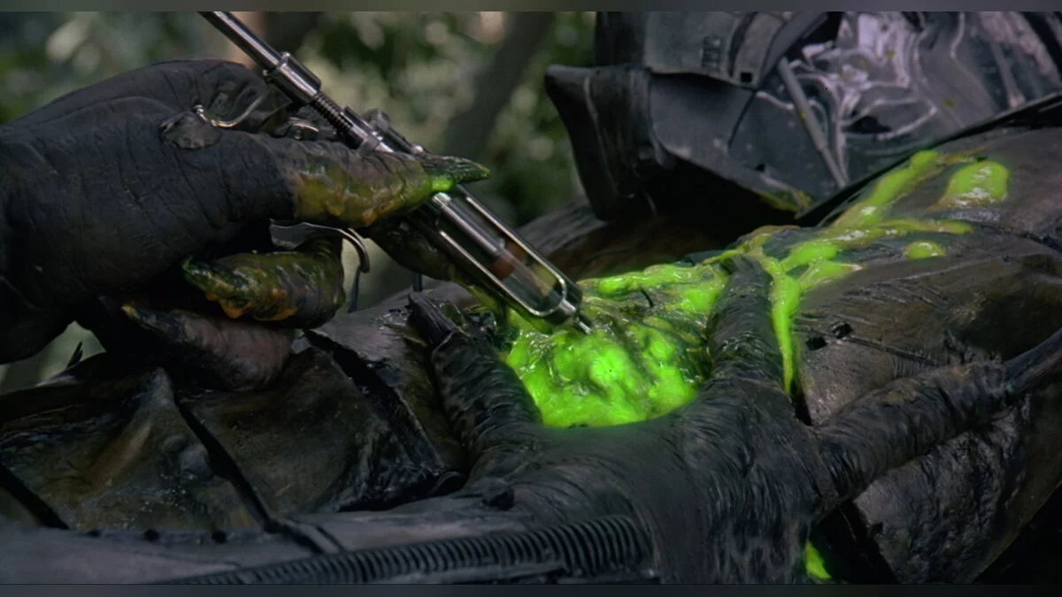 В оригинальной картине была сцена, где пришелец залечивал свои раны, используя походную аптечку, но в новинке процесс показан более простым и эффективным. Похоже, цивилизация охотников в медицине не преуспела.