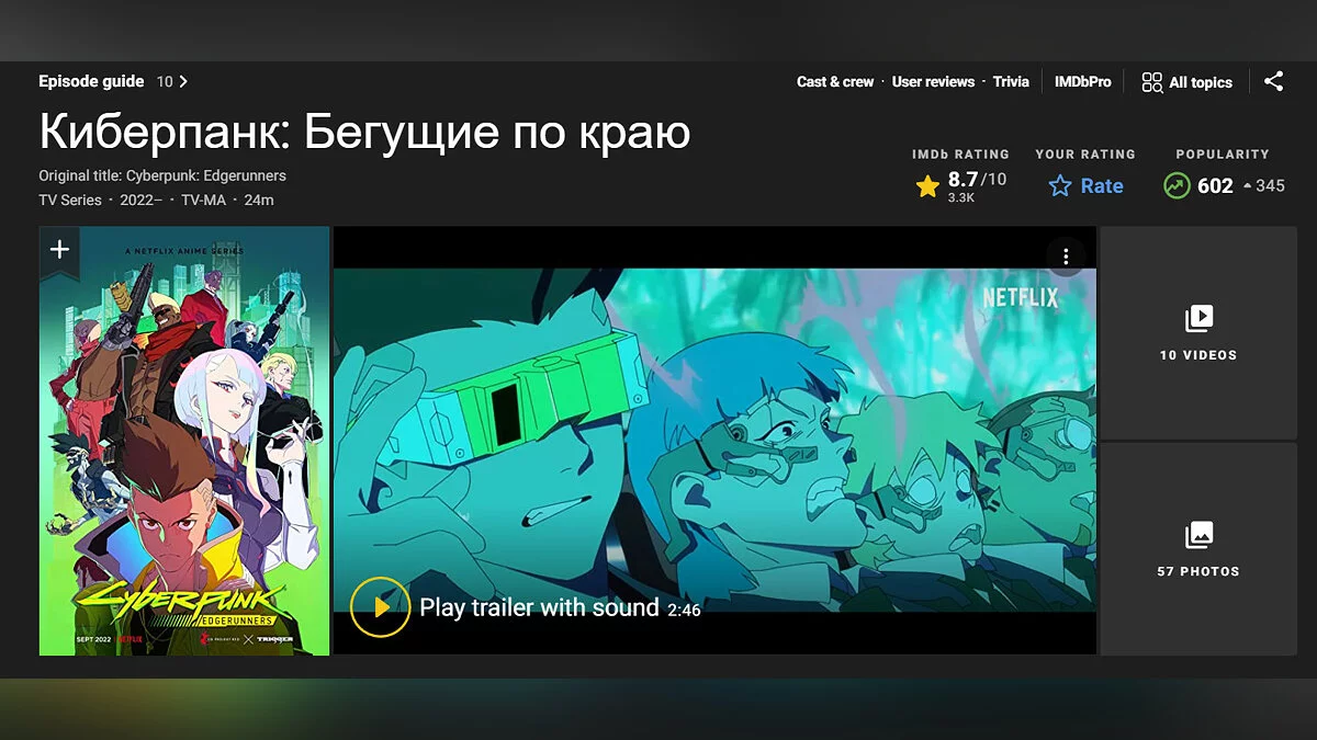 Судя по комментарию, Cyberpunk: Edgerunners очень сильно понравился Майку Пондсмиту. Кстати, зрителям аниме-сериал тоже пришелся по вкусу. На момент написания новости его оценка на IMDb составляет 8,7 балла.