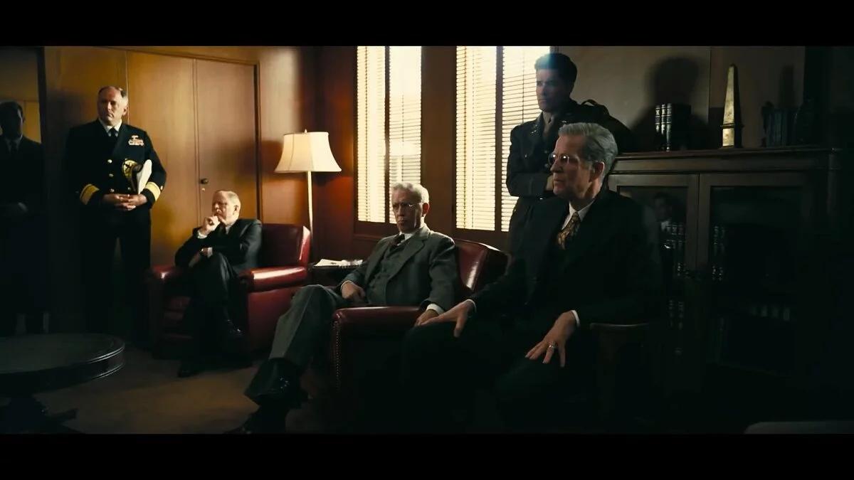 Одна из самых эффектных сцен фильма, настоящая находка Нолана, показана уже в первой трети. Роберта допрашивают на спецкомитете, подозревая в госизмене. Допрашивающий в весьма грубой форме выясняет детали отношений Роберта с любовницей. Для допрашивающего подобная связь — просто еще одна возможность обмена информацией с коммунистами. Своими расспросами он буквально выставляет Роберта голым. В то же время для Оппенгеймера — это личная трагедия и неразделенная любовь, с потерей которой он не может смириться. А присутствующая на том же допросе жена Роберта представляет только саму измену. В общем, поставлено настолько эффектно, что одну и ту же ситуацию зритель видит с совершенно разных сторон.