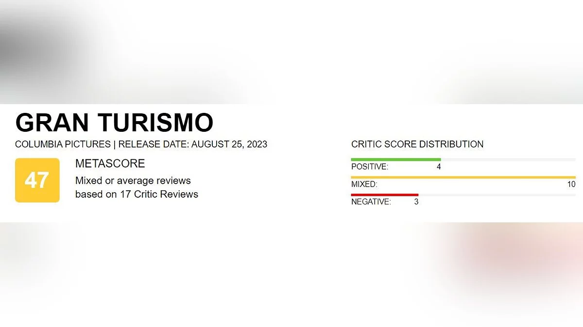 На сайте Metacritic появились первые оценки предстоящего фильма «Гран Туризмо», основанного на одноименной серии гоночных игр Sony. На момент написания новости рейтинг кинокартины составляет 47 баллов.