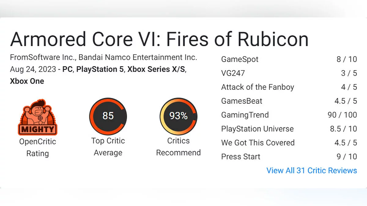 За два дня до релиза Armored Core 6 начали появляться первые обзоры. Судя по оценкам, FromSoftware снова сделала отличную игру — её средний балл на OpenCritic равен 85/100.