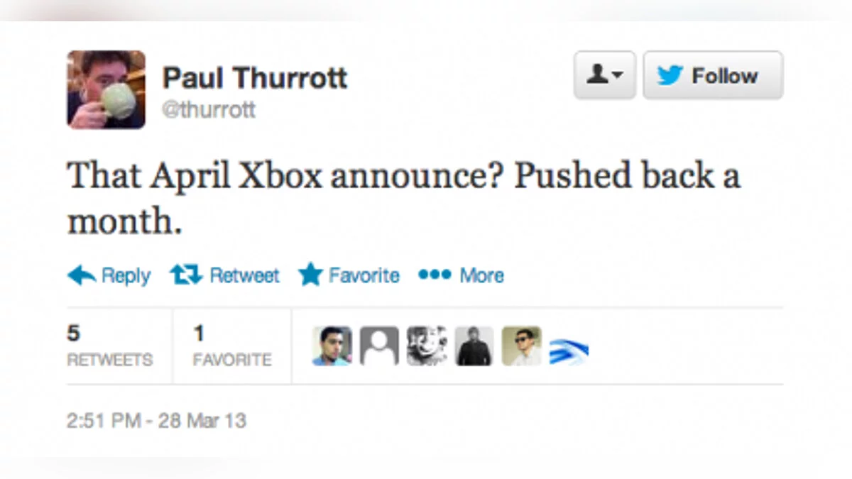 Пол Тарротт (Paul Thurrott), который первым обнаружил недавно зарегистрированный домен XboxEvent.com, а также сообщил о грядущем анонсе новой консоли Microsoft, заявил, что Xbox 720 не покажут в апреле.