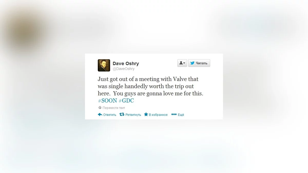 Незадолго после этого Дэйв Ошри (Dave Oshry), один из маркетологов Interceptor Entertainment, подлил масла в огонь, написав на своей Твиттер-страничке следующее: «Только что с собрания Valve, которое полностью стоило всех затраченных усилий, чтобы добраться сюда. Вы, ребята, полюбите меня за это». Свой твит он снабдил хэштегами #SOON и #GDC.