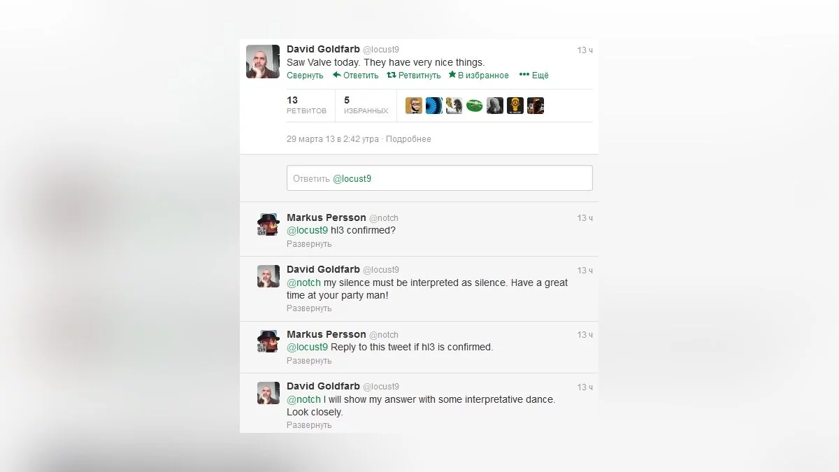 Ведущий дизайнер и сценарист Battlefield 3 Дэвид Голдфарб (David Goldfarb) привлёк внимание практически всей индустрии к своему Твиттер-аккаунту всего одним сообщением: «Видел сегодня Valve. У них есть кое-что весьма интересное». И всё бы ничего (подумаешь, кто такого не писал, спекулируя на имени Half-Life?), если бы Маркус «Нотч» Перссон (Markus «Notch» Persson), создатель Minecraft, не поинтересовался в ответ, подтвердили ли разработку Half-Life 3. Мистер Голдфарб предпочёл отмолчаться, на что Нотч решил пойти на уловку, попросив того просто ответить на твит, если третья часть действительно была подтверждена. И угадайте, что? Голдфарб ответил:
