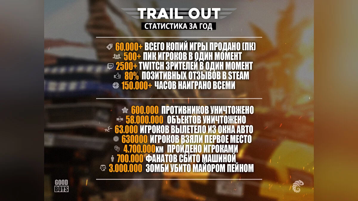 Разработчики российской гонки Trail Out из студии GOOD BOYS решили отпраздновать первую годовщину игры, выпустив новое обновление. Оно, по словам авторов, стало последним.