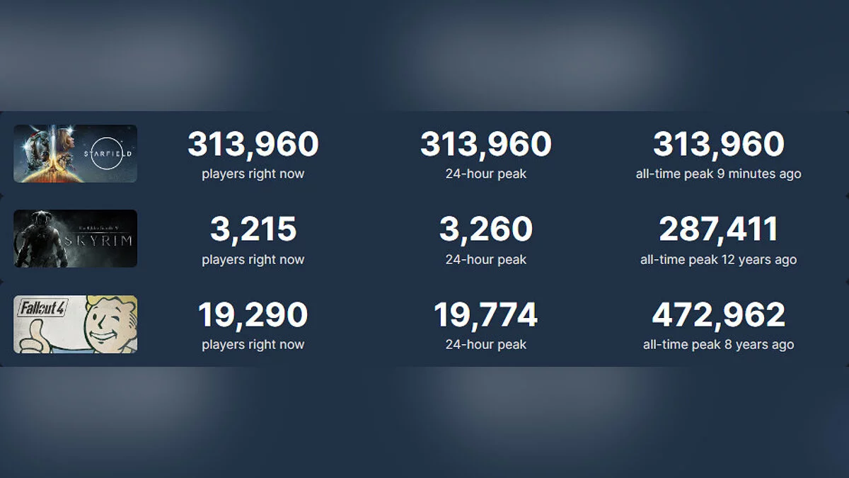 Starfield смогла обойти Skyrim по числу игроков в Steam. Пик онлайна новинки превысил 314 тысяч человек. Это на 27 тысяч больше, чем у пятой The Elder Scrolls. Хоть Starfield и обогнала Skyrim, самой популярной игрой Bethesda она не стала. Рекорд принадлежит Fallout 4, пик онлайна которой составил 473 тысячи человек на старте. Очевидно, Starfield уже не сможет превзойти этот результат.