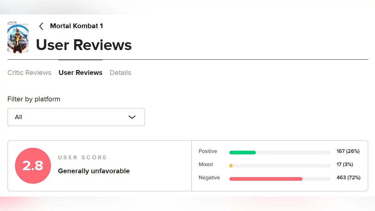 Спустя несколько дней после раннего релиза Mortal Kombat 1 на Metacritic появилась возможность ставить пользовательские оценки. За несколько часов игра утонула в негативных отзывах.