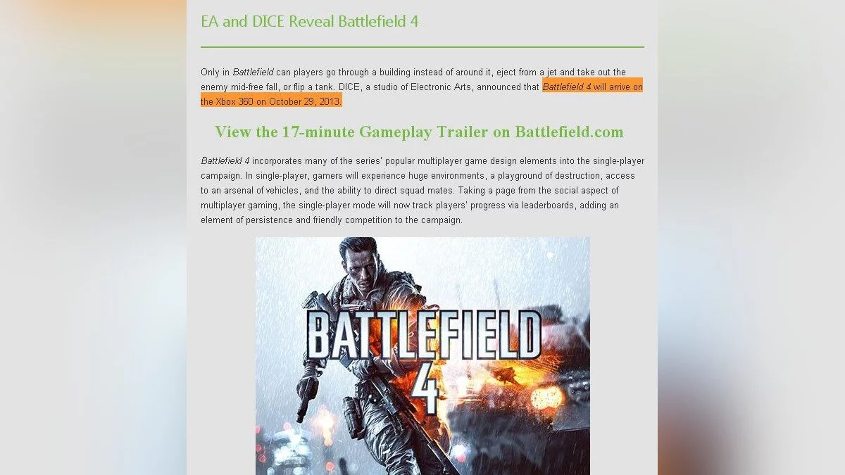 «Только в Battlefield 4 игроки могутвыпрыгнуть из самолета и, во время свободного падения, убить врага на земле, прорубить проход через здание или же перевернуться в танке», — сообщается в рекламном сообщении. — «Студия DICE объявила, что Battlefield 4 выйдет на Xbox 360 29 октября 2013 года».