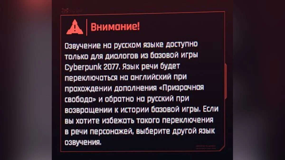 Портал также опубликовал текст с предупреждением, которое увидят русскоязычные игроки при запуске дополнения. Поскольку у Cyberpunk 2077 есть русская озвучка, а у Phantom Liberty — нет, периодически игра будет переключаться с одного языка на другой.