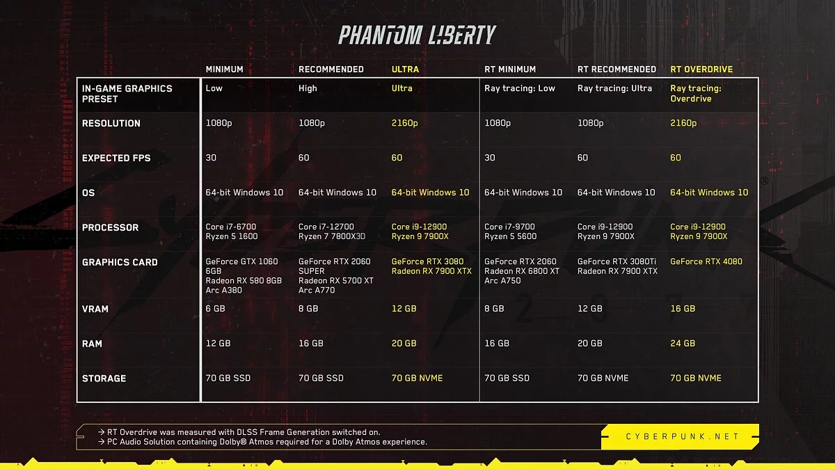 Для наглядности — вот системные требования оригинальной Cyberpunk 2077, которые студия публиковала в 2020 году.