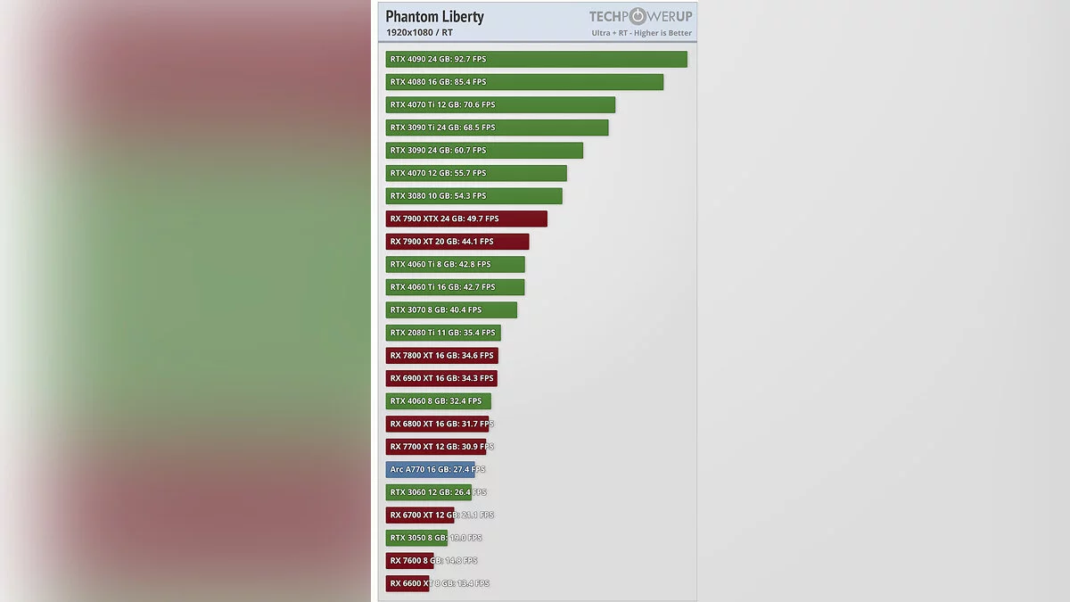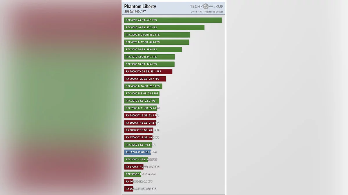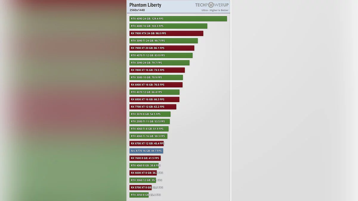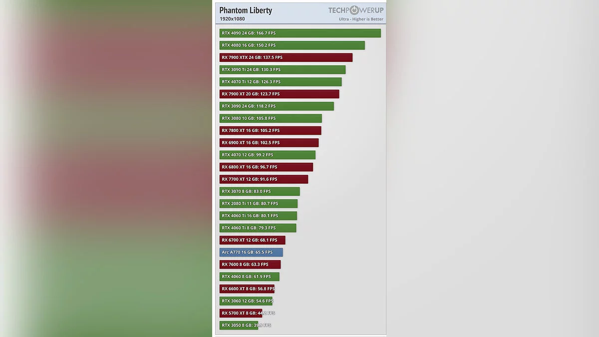 Вместе с первыми оценками в сети появились результаты технических тестов Cyberpunk 2077: Phantom Liberty. Издание TechPowerUp рассказало в новой статье, как игра работает на видеокартах NVIDIA, AMD и Intel.