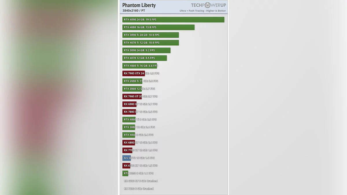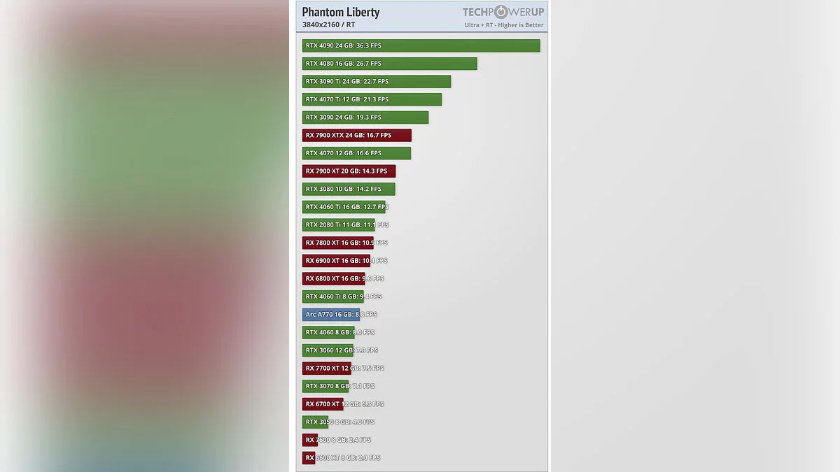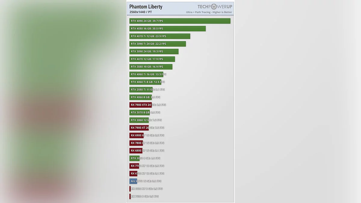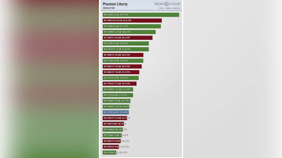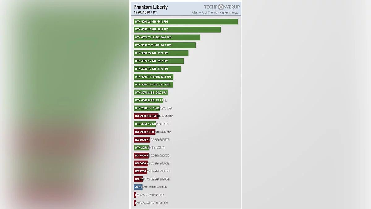 Вместе с первыми оценками в сети появились результаты технических тестов Cyberpunk 2077: Phantom Liberty. Издание TechPowerUp рассказало в новой статье, как игра работает на видеокартах NVIDIA, AMD и Intel.