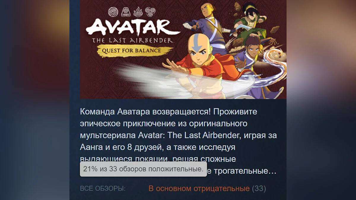 Релиз Avatar: The Last Airbender — Quest for Balance в Steam оказался большим провалом. Проект не только не смог привлечь внимание геймеров, но и получил разгромные отзывы. В пике онлайна в игре находились всего 81 человек, а её рейтинг составил 21%. Что касается критиков, то они даже не стали обозревать игру — на Metacritic и OpenCritic у неё нет ни одной оценки.