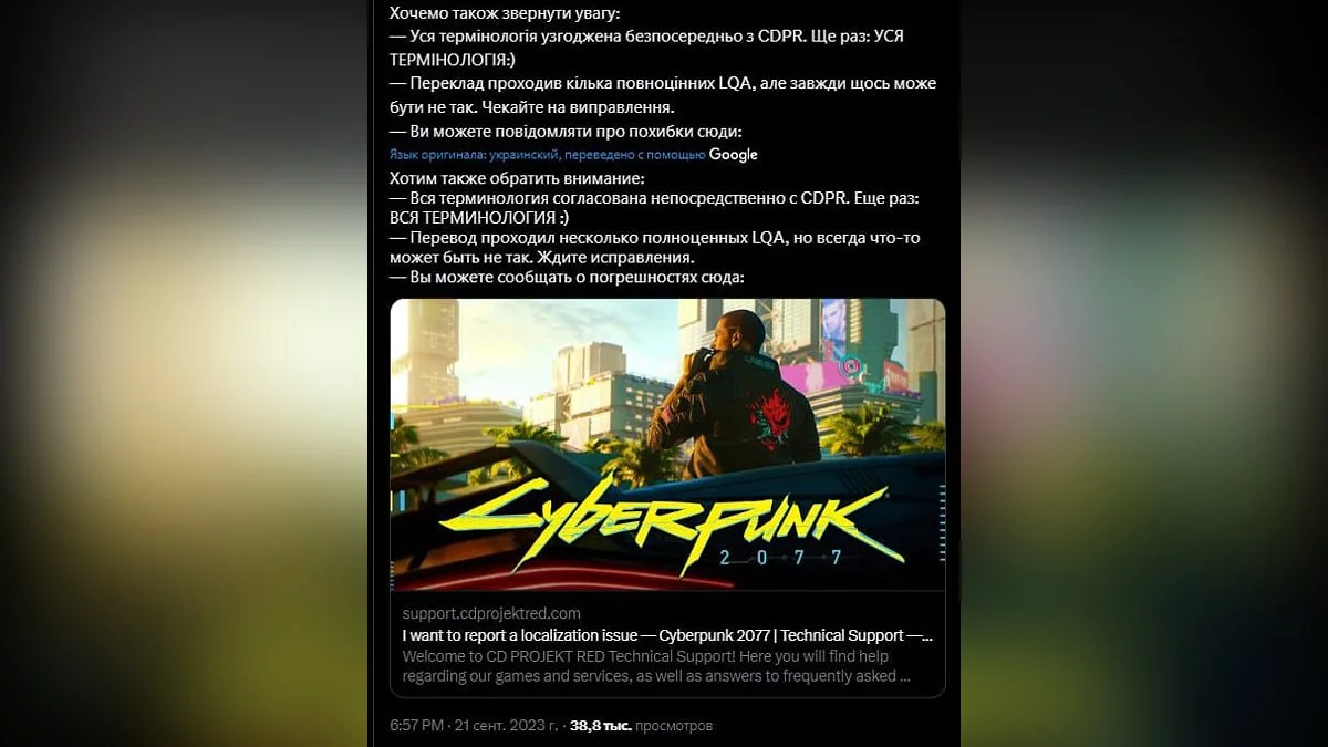 25 сентября CD Projekt RED опубликовала в своём русскоязычном Telegram-канале и сообществе Cyberpunk 2077 во «ВКонтакте» извинение перед игроками из России за некорректную украинскую локализацию. Студия попросила прощения и пообещала исправить перевод в ближайшем патче.