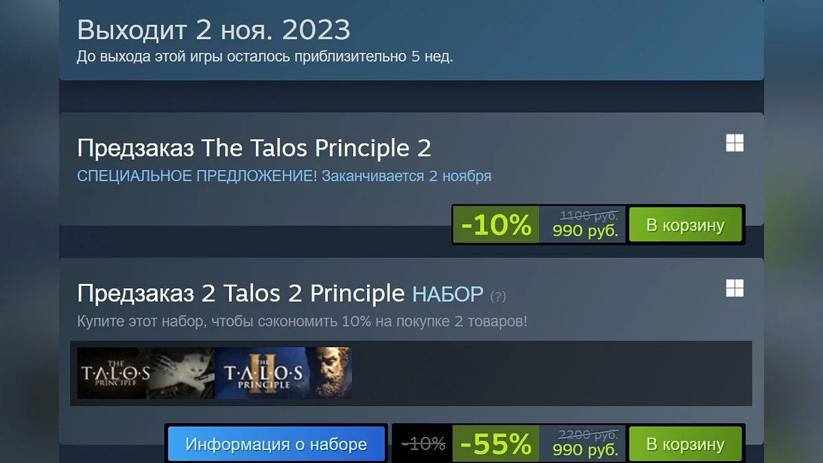 Также в сервисе Steam открылся предзаказ. Стандартное издание стоит 990 рублей — после релиза цена увеличится до 1100 рублей. Также в продаже появился комплект, куда входят первая и вторая части — его тоже отдают за 990 рублей. В Беларуси за игру просят 13 долларов.